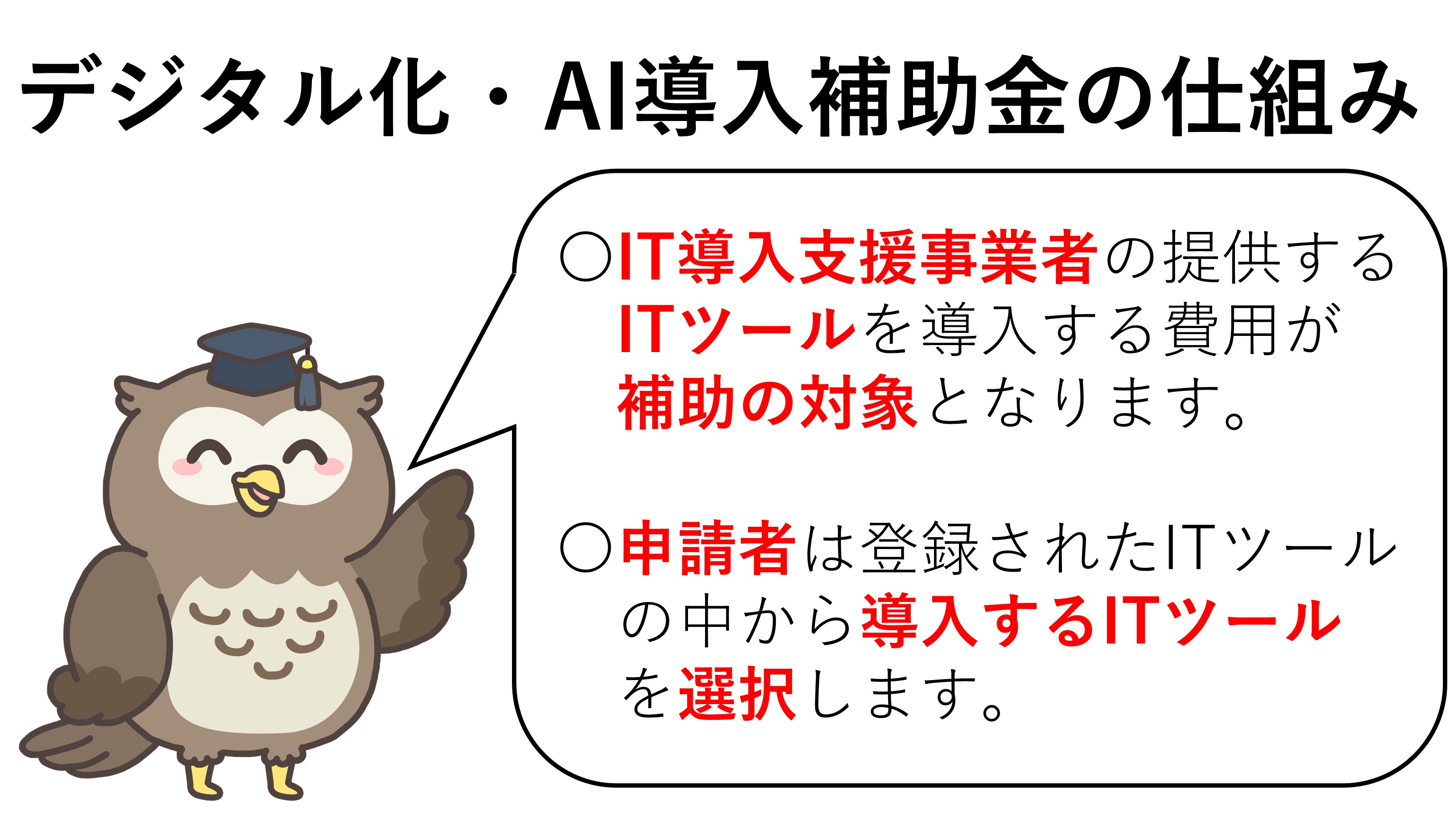 デジタル化・AI導入補助金は、申請者(補助事業者)が、IT導入支援事業者(要登録)の提供する、あらかじめ事務局に登録された「ITツール」を導入する費用を補助します。