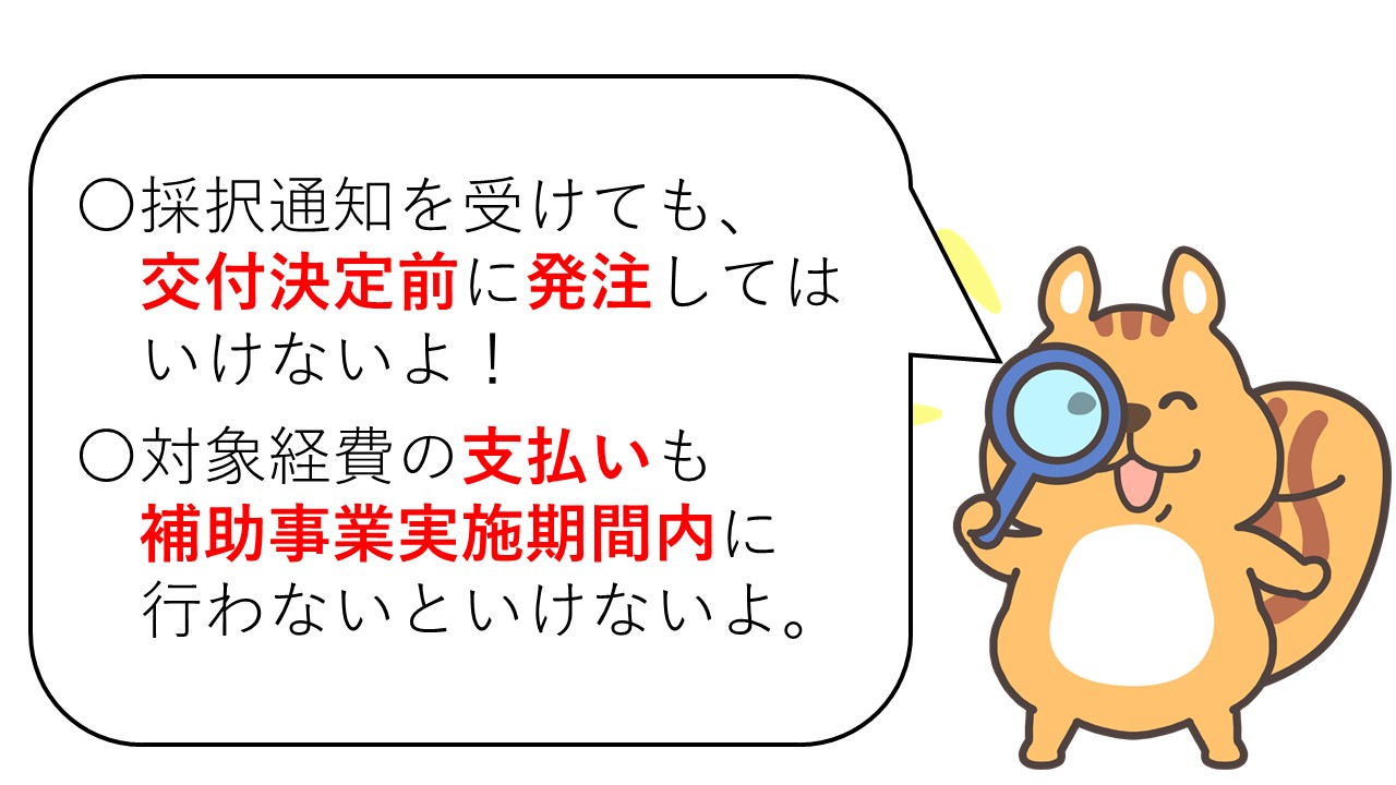 交付決定日から10か月以内の補助事業実施期間内に、発注・納入・検収・支払等のすべての事業の手続が完了する必要があります。