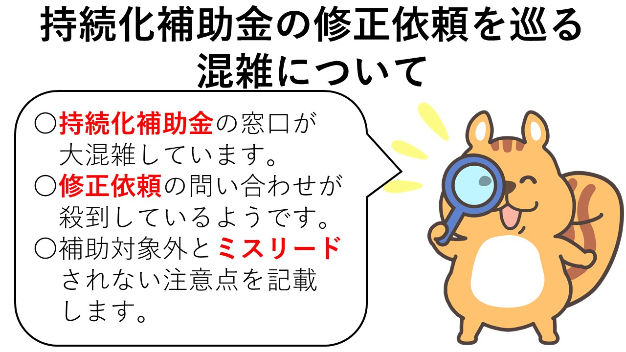 小規模事業者持続化補助金の修正依頼の内容と対応について、以下のページに記載しております。