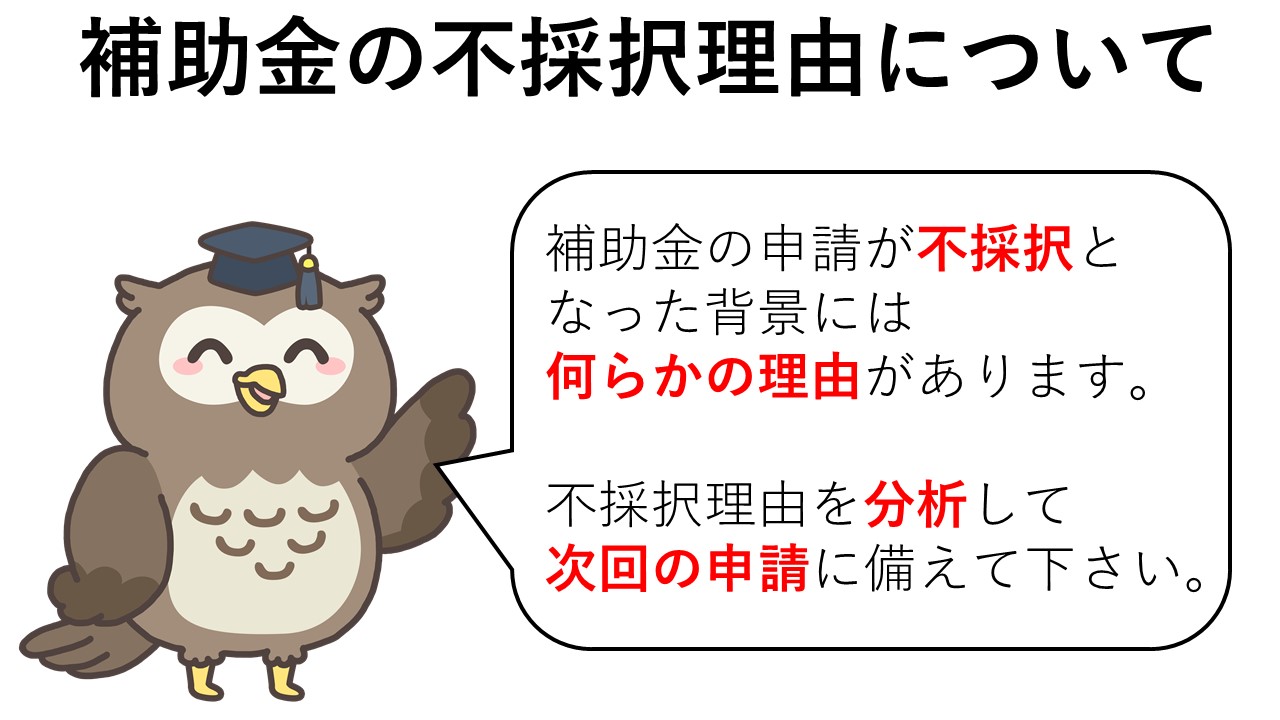 そのため、補助金が不採択になった場合、その背景には何らかの理由があるものと考えられます。