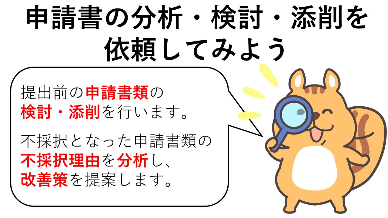 これらの不採択理由について心当たりはあるものの、説得力のある申請書をまとめる自信がない、あるいは、自分の申請書がどの不採択理由に当たるのかがわからないという方は、弊所の「申請書の分析・検討・添削サービス」の利用をお勧め致します。
