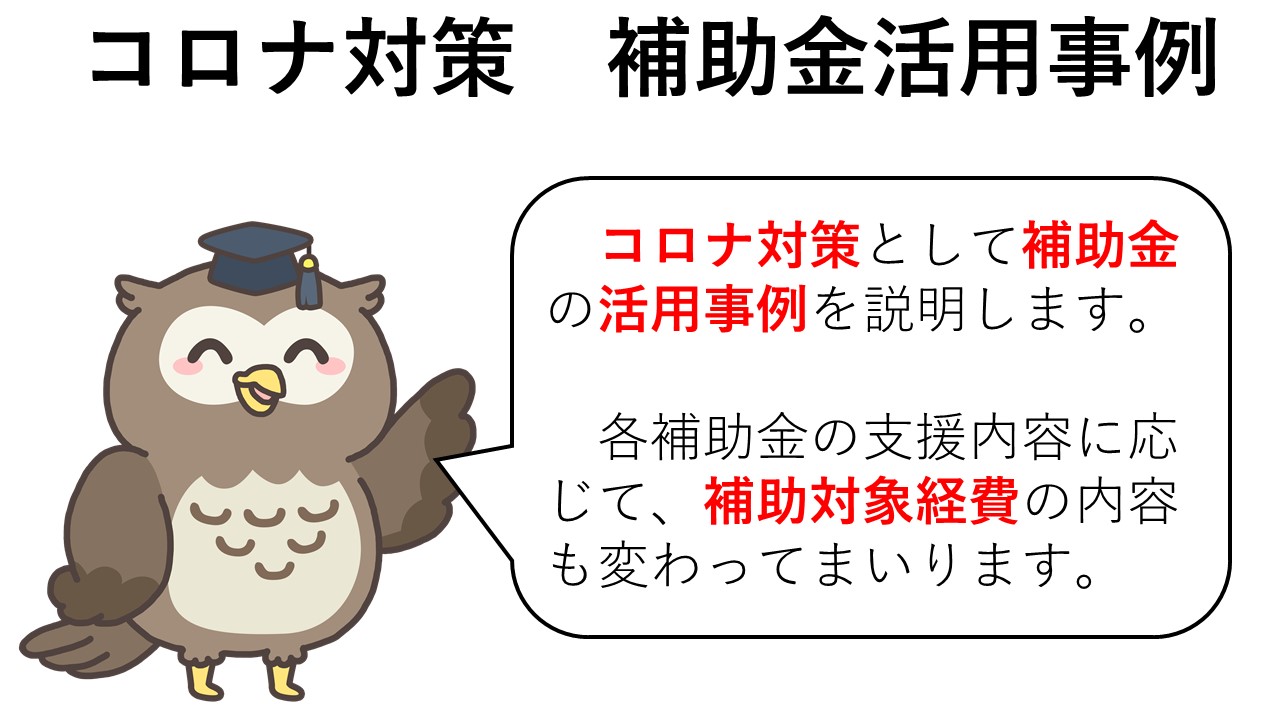 〇ユニフォームのクリーニング外注費、トイレ用ペーパータオル・使い捨てアメニティ用品の購入費、従業員指導などのための専門家活用費、体温計・サーもカメラ・キーレスシステム・インターホン・コイントレー・携帯型アルコール検知器の購入費