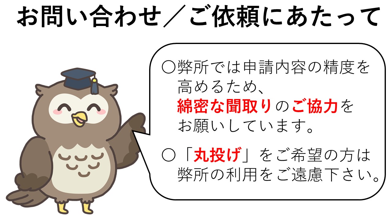 すぎな行政書士事務所では、申請書類の精度を高めるため、綿密な聞き取りへのご協力をお願いしております。「丸投げ」の依頼をご希望の方は、弊所の利用をご遠慮下さい。