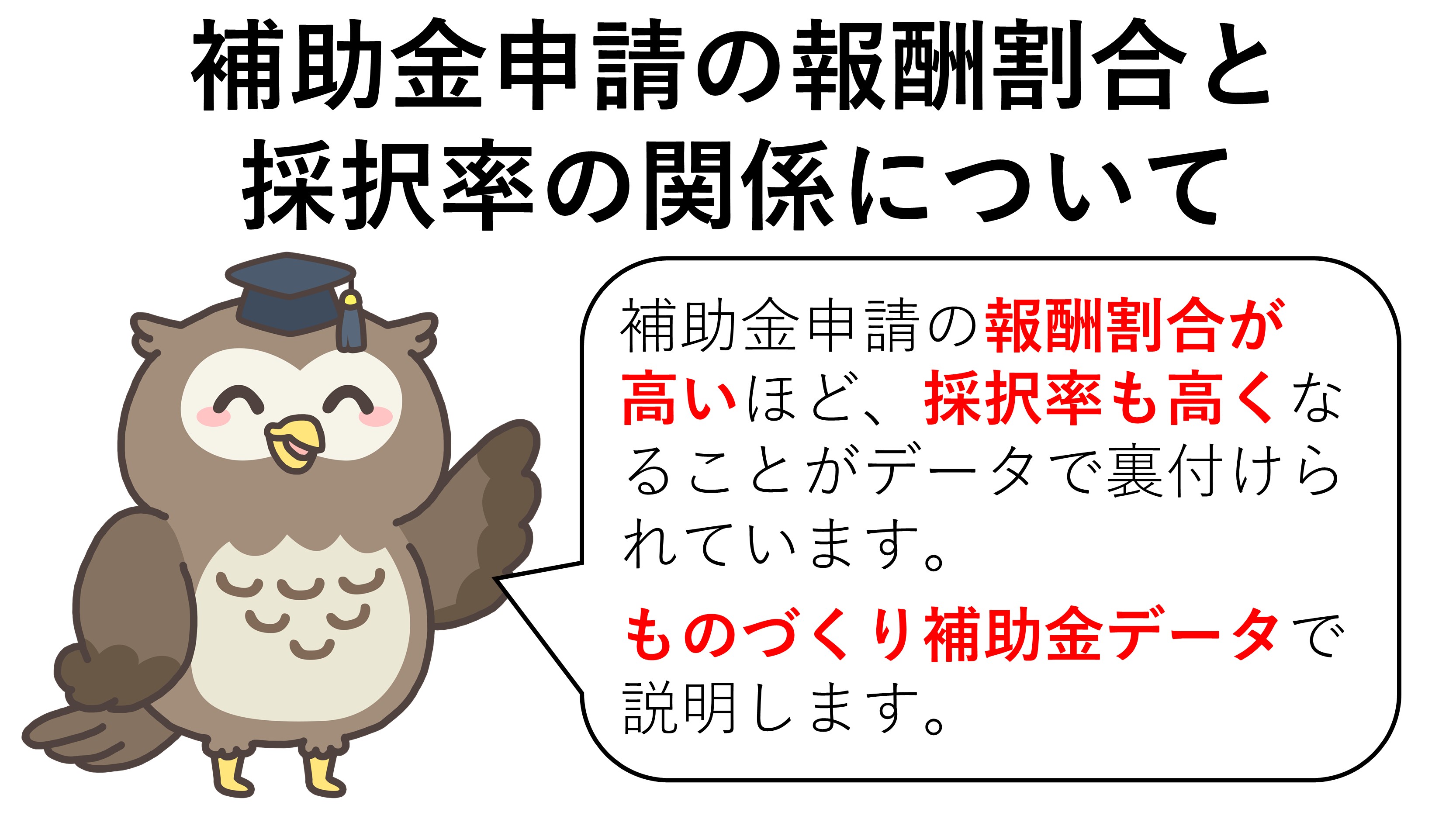 高い・安いは相対的な判断なのですが、「報酬の多寡と採択率の関係」について、ものづくり補助金総合サイトに興味深いデータが示されていますので、ご紹介させていただきます。