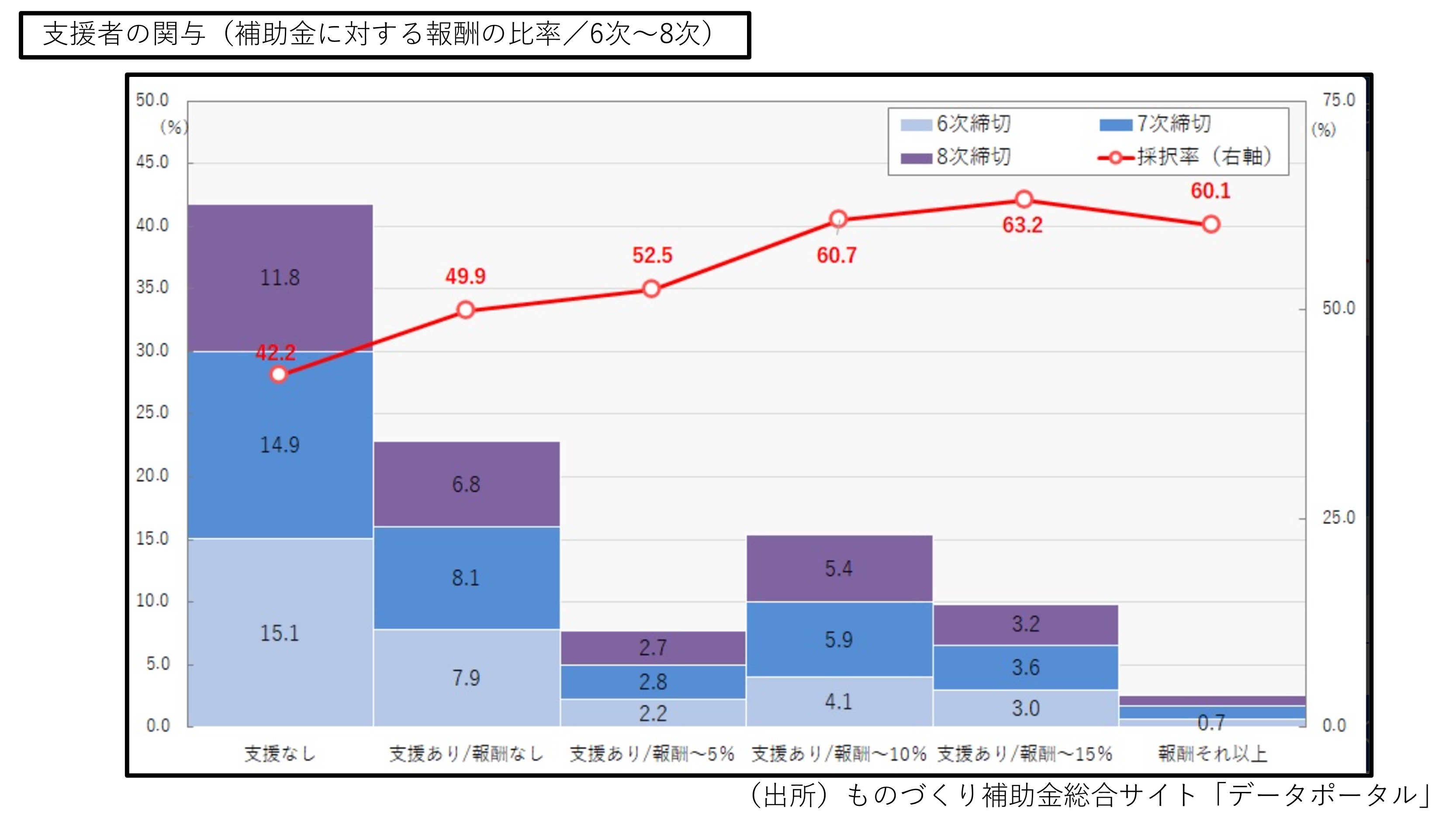 その中に、「支援者の関与(補助金に対する報酬の比率)」という項目があり、「支援の有無・報酬割合」と「採択率」に関するデータを公表しています。