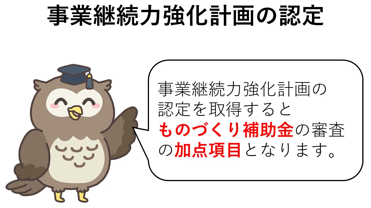・ 事業継続力強化計画の認定は、ものづくり補助金の審査の加点項目になります。