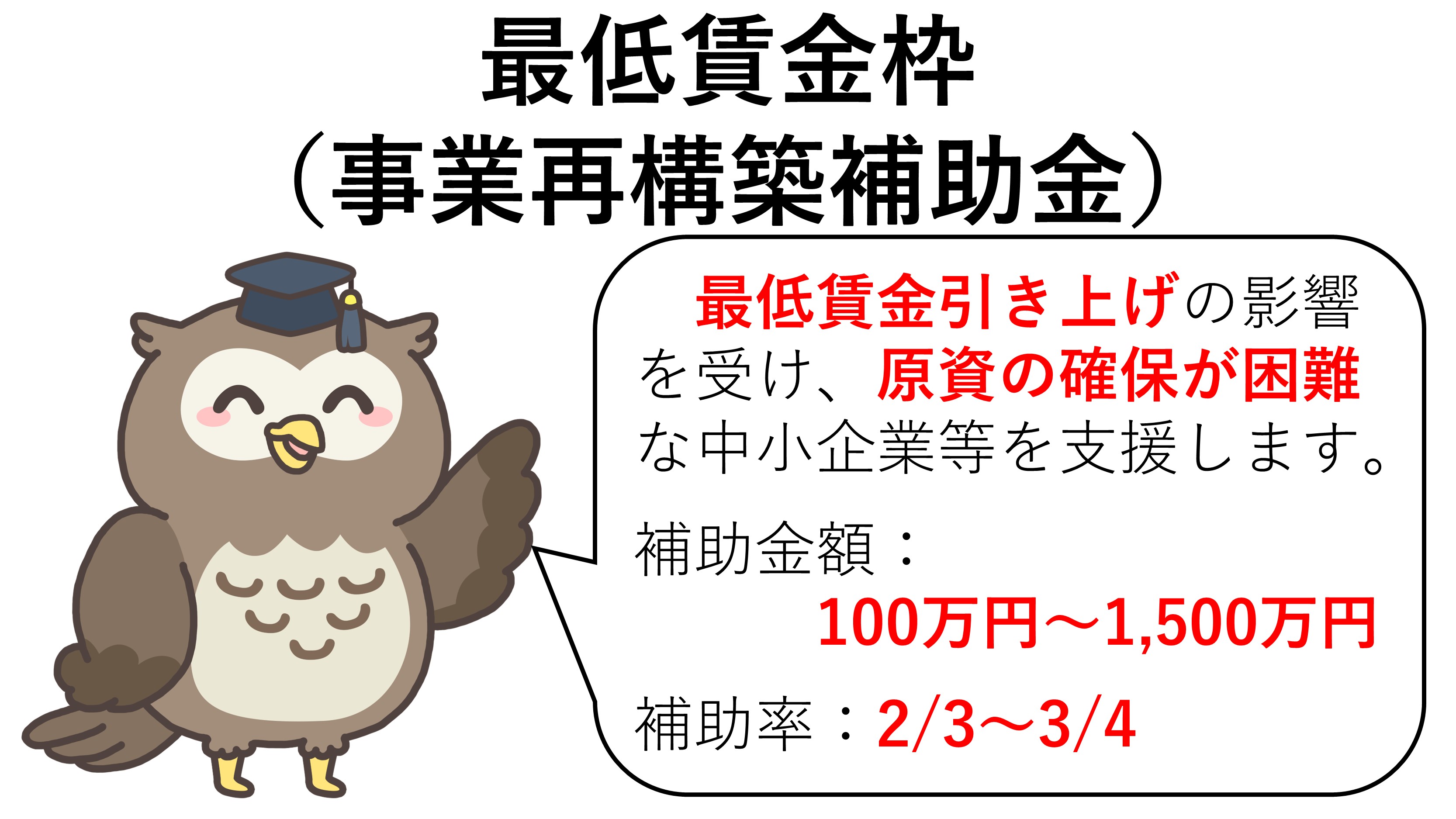 最低賃金引上げの影響を受け、その原資の確保が困難な特に業況の厳しい中小企業等の事業再構築を支援。