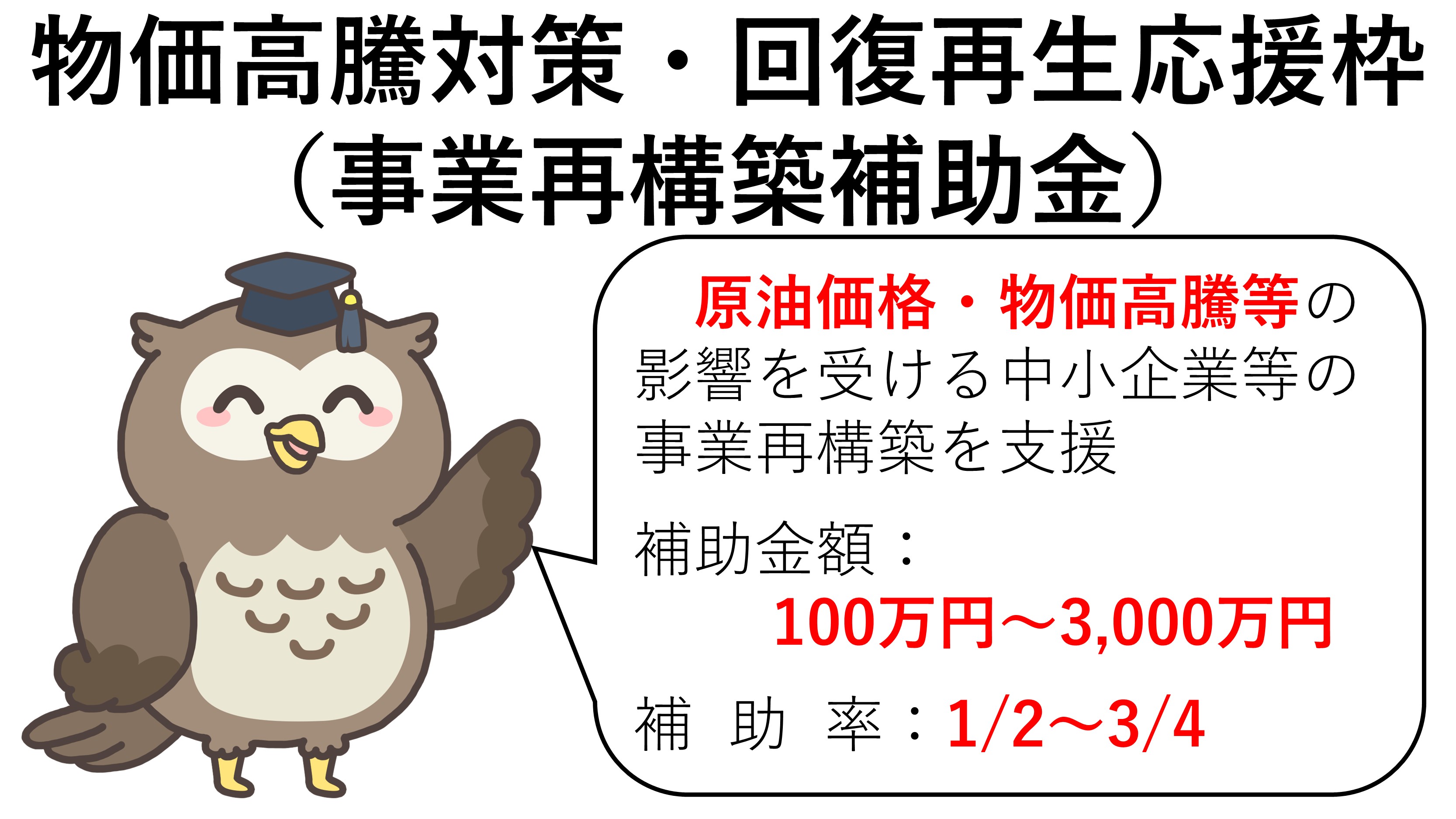 業況が厳しい事業者や事業再生に取り組む中小企業等、原油価格・物価高騰等の影響を受ける中小企業等の事業再構築を支援。