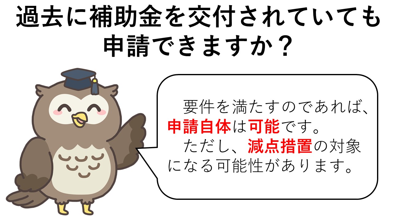 ただし、過去3年間に類似の補助金の交付を受けた事業者については、審査上、減点措置が講じられます。