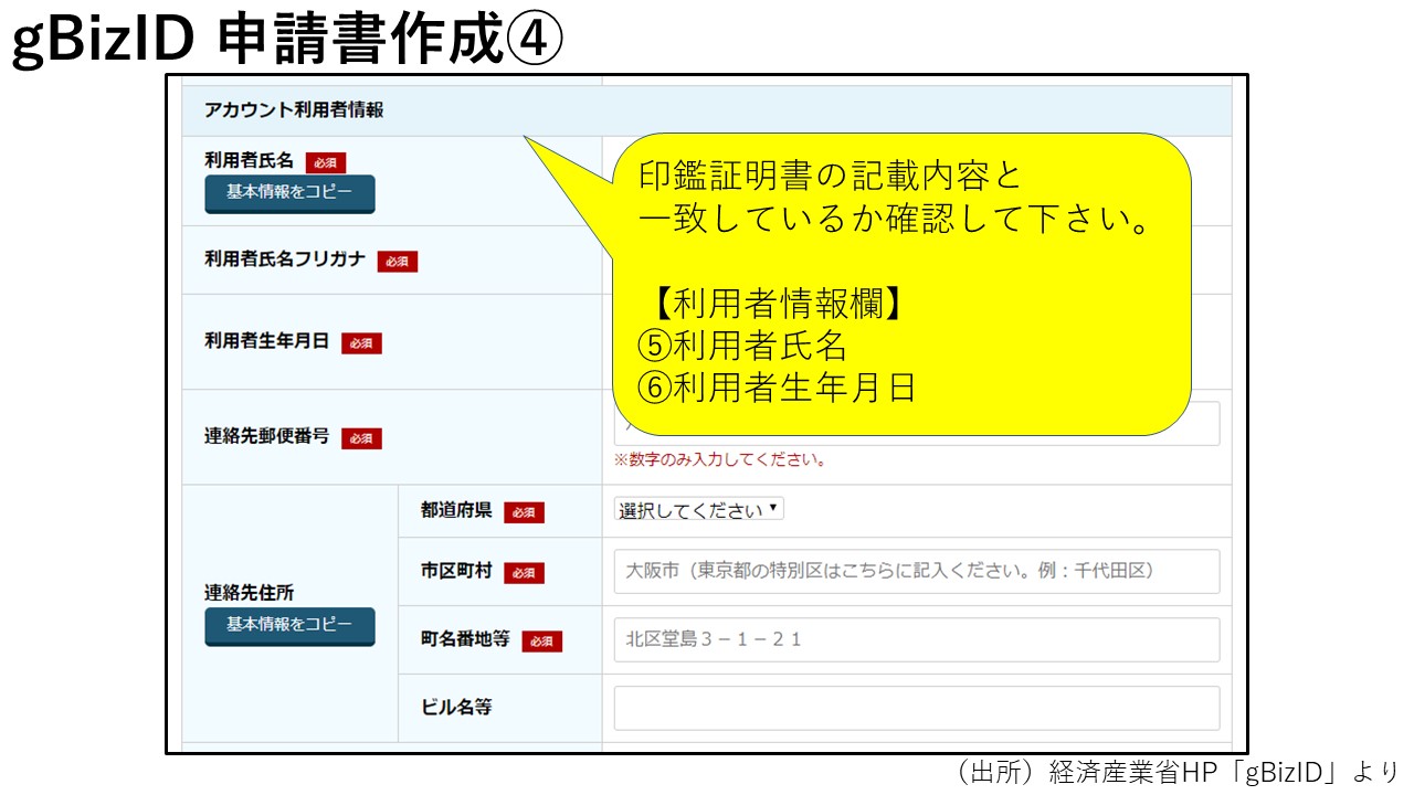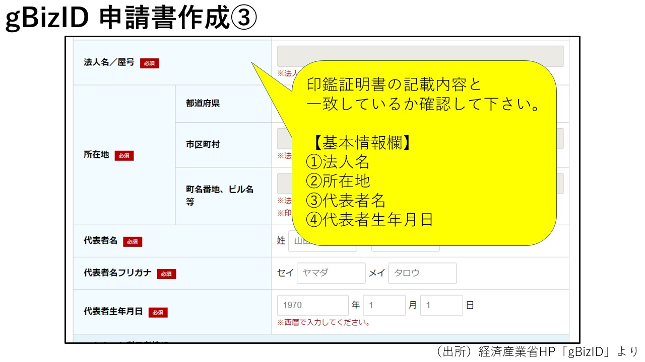GビズIDプライムは、代表者のアカウントであるため、以下の入力内容が一致している必要があります。